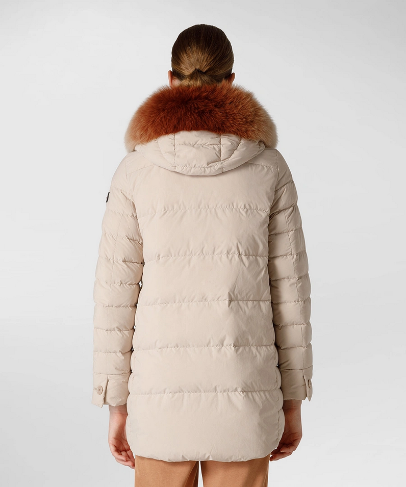 cursore, ampie tasche laterali e collo con pelliccia di volpe in tono colore col capo. Il modello versatile,